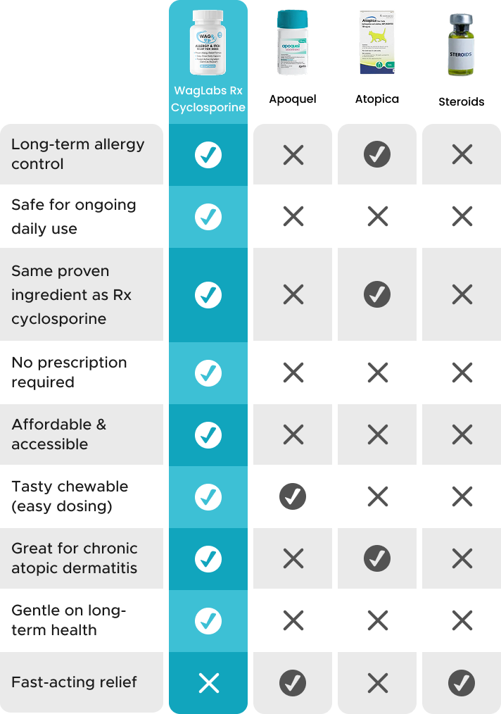 Our chewable tablets contain the same active ingredient as Atopica® but at nearly half the price and without the need for a prescription—making WagRx the smarter, more affordable choice for lasting allergy relief.