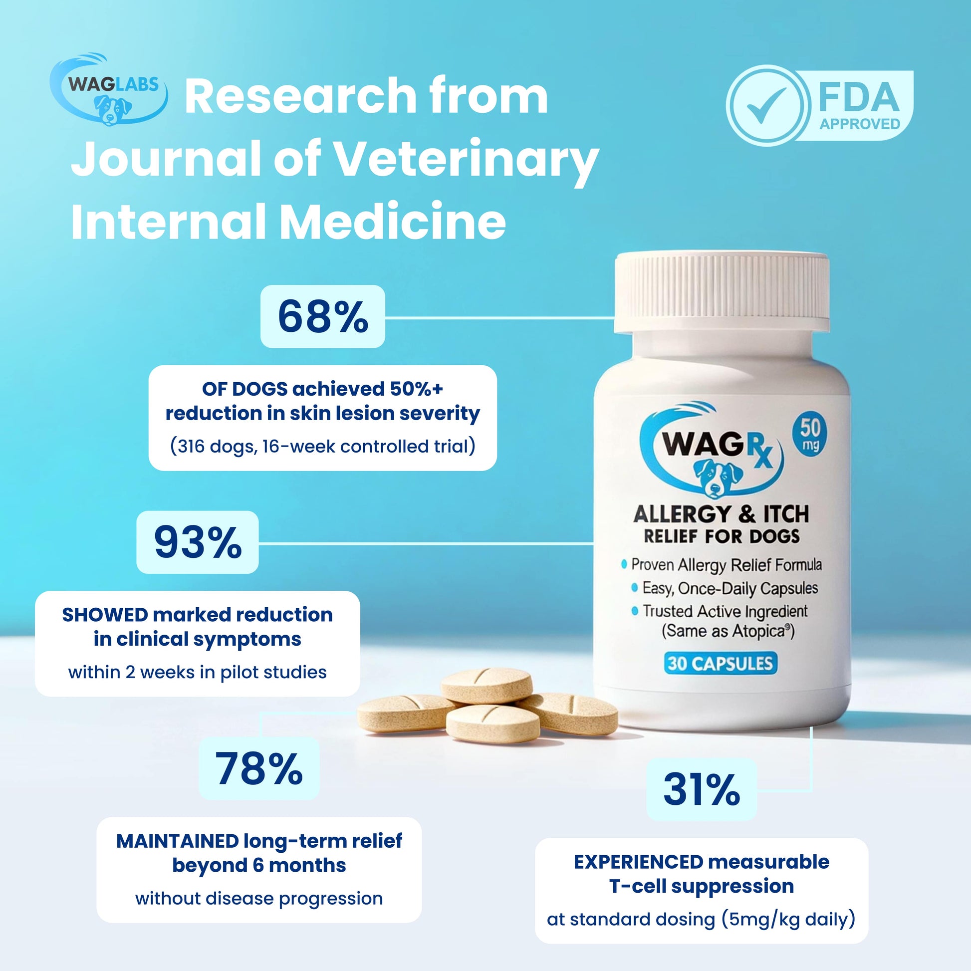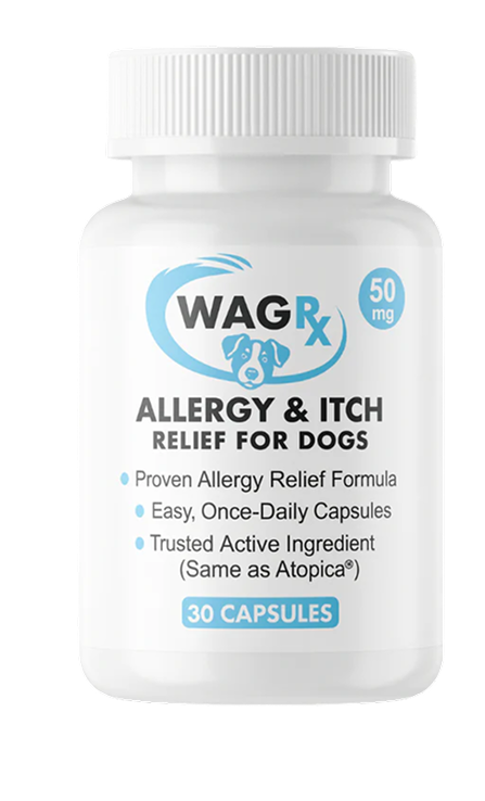 WagRx™ contains the same pharmaceutical-grade active ingredient found in other popular allergy treating medications—the exact formulation veterinarians have trusted for years. It works by modulating the immune response at the cellular level, reducing inflammation, and allowing the skin's natural barrier to heal. You get the same proven results without the prescription markup or vet visit fees.”